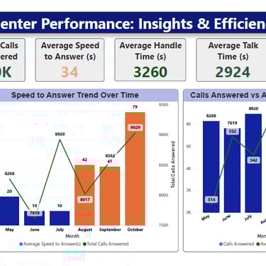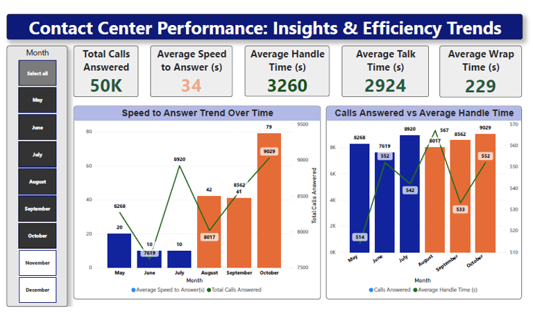 This dashboard provides a complete overview of contact center operations, focusing on call volumes, customer handling performance, queue behavior, agent responsiveness, and channel efficiency.